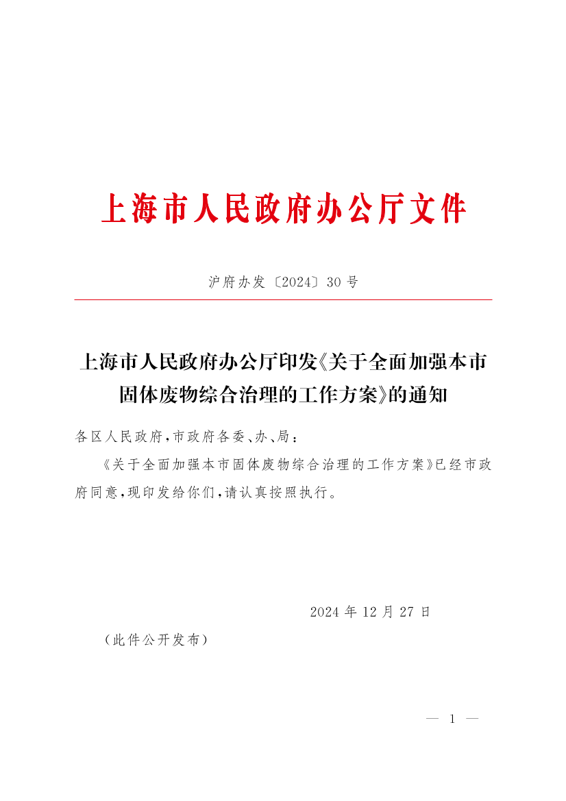 上海市人民政府辦公廳印發(fā)《關(guān)于全面加強(qiáng)本市固體廢物綜合治理的工作方案》的通知