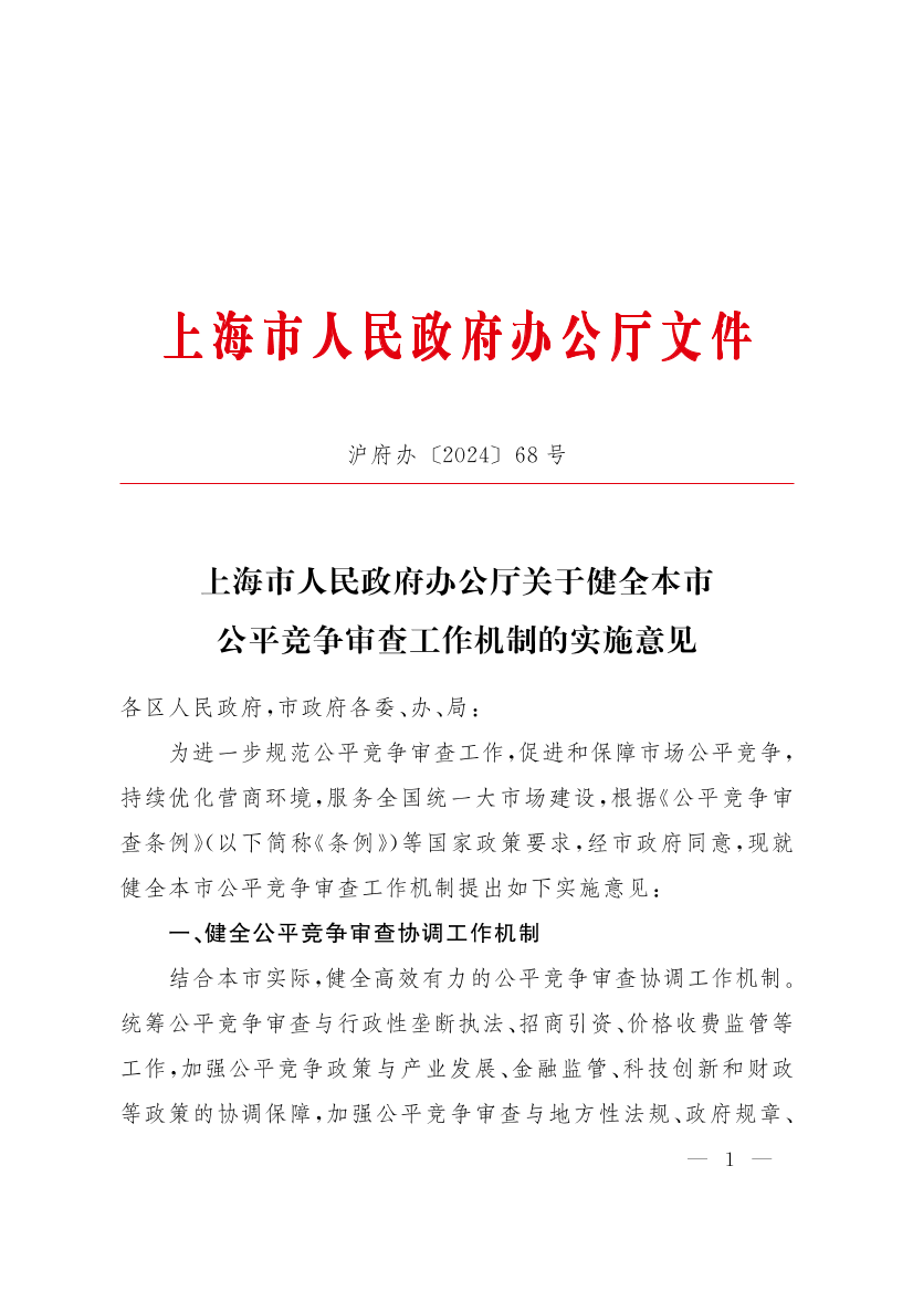 上海市人民政府辦公廳關(guān)于健全本市公平競(jìng)爭(zhēng)審查工作機(jī)制的實(shí)施意見