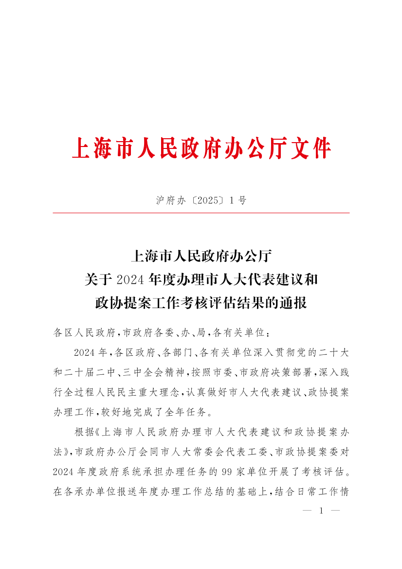 上海市人民政府辦公廳關(guān)于2024年度辦理市人大代表建議和政協(xié)提案工作考核評(píng)估結(jié)果的通報(bào)