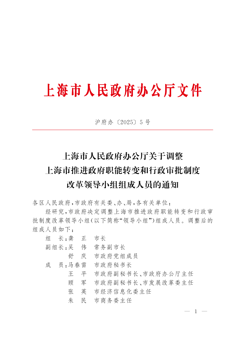 ??經(jīng)研究,市政府決定調(diào)整上海市推進(jìn)政府職能轉(zhuǎn)變和行政審批制度改革領(lǐng)導(dǎo)小組(以下簡稱“領(lǐng)導(dǎo)小組”)組成人員。調(diào)整后的組成人員如下: