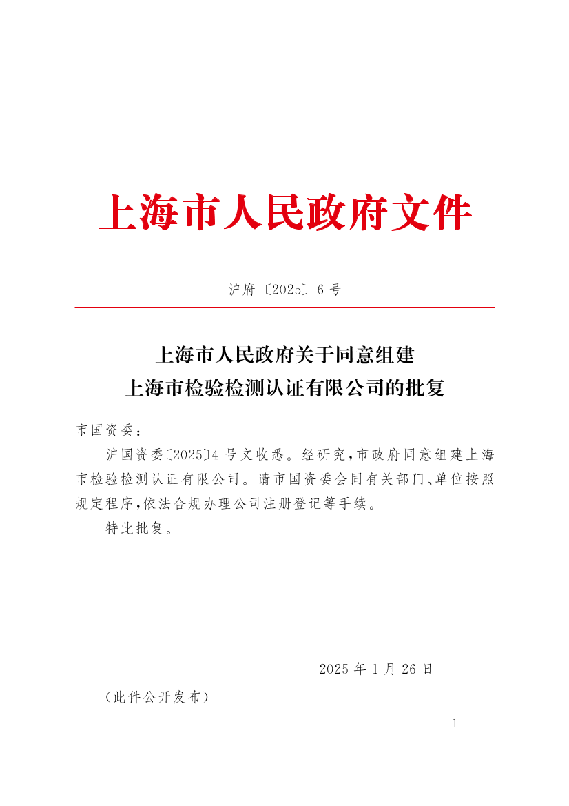 ??滬國資委〔2025〕4號(hào)文收悉。經(jīng)研究,市政府同意組建上海市檢驗(yàn)檢測(cè)認(rèn)證有限公司。請(qǐng)市國資委會(huì)同有關(guān)部門、單位按照規(guī)定程序,依法合規(guī)辦理公司注冊(cè)登記等手續(xù)。