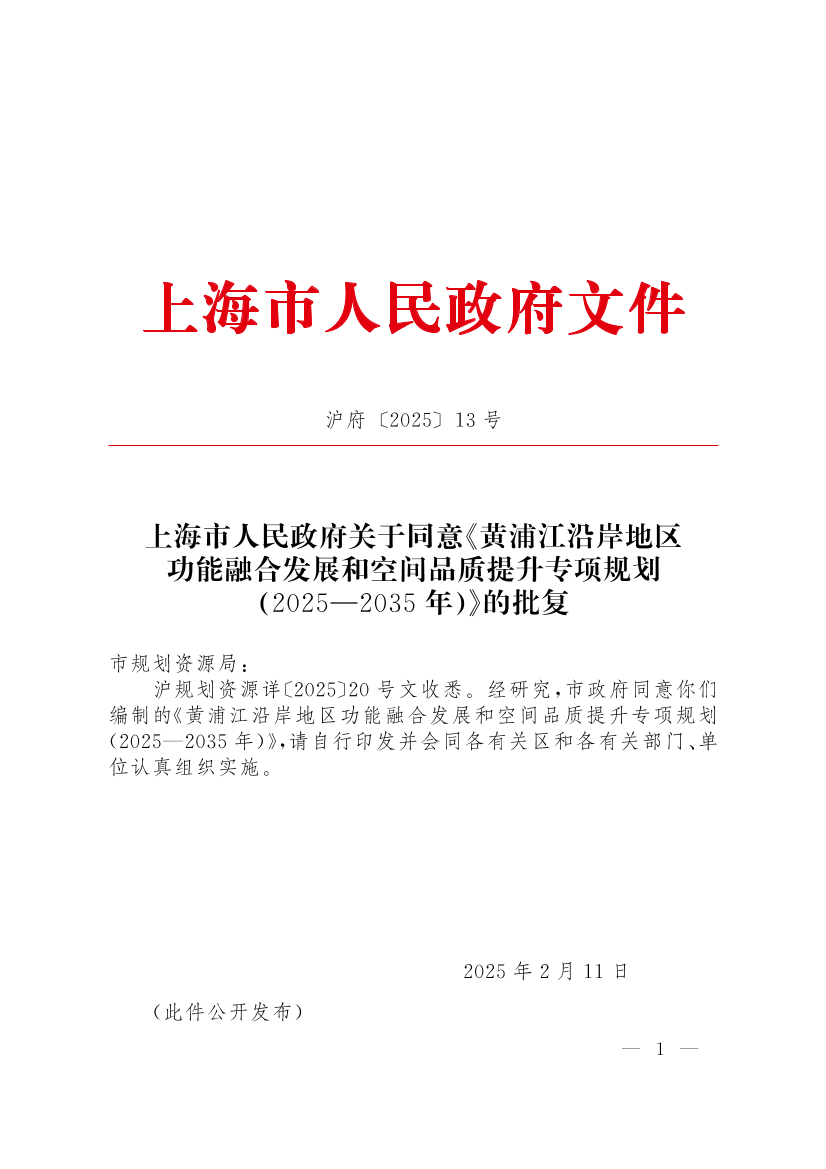 上海市人民政府關(guān)于同意《黃浦江沿岸地區(qū)功能融合發(fā)展和空間品質(zhì)提升專項規(guī)劃(2025—2035年)》的批復(fù)