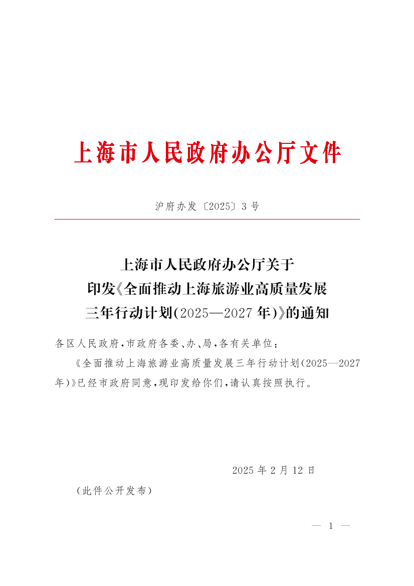 ??《全面推動上海旅游業(yè)高質(zhì)量發(fā)展三年行動計(jì)劃(2025—2027年)》已經(jīng)市政府同意,現(xiàn)印發(fā)給你們,請認(rèn)真按照執(zhí)行。