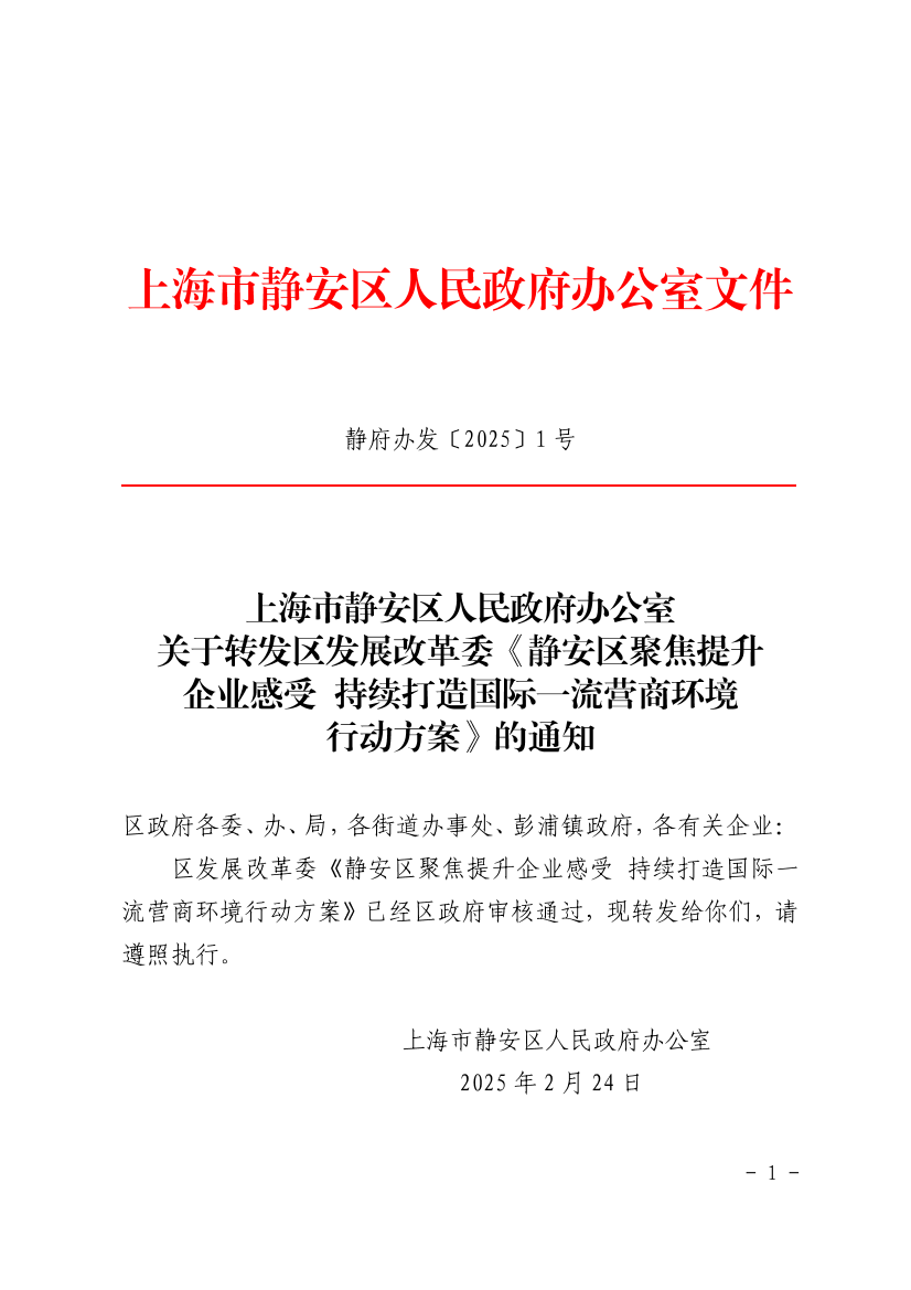 關于轉發(fā)區(qū)發(fā)展改革委《靜安區(qū)聚焦提升企業(yè)感受 持續(xù)打造國際一流營商環(huán)境行動方案》的通知