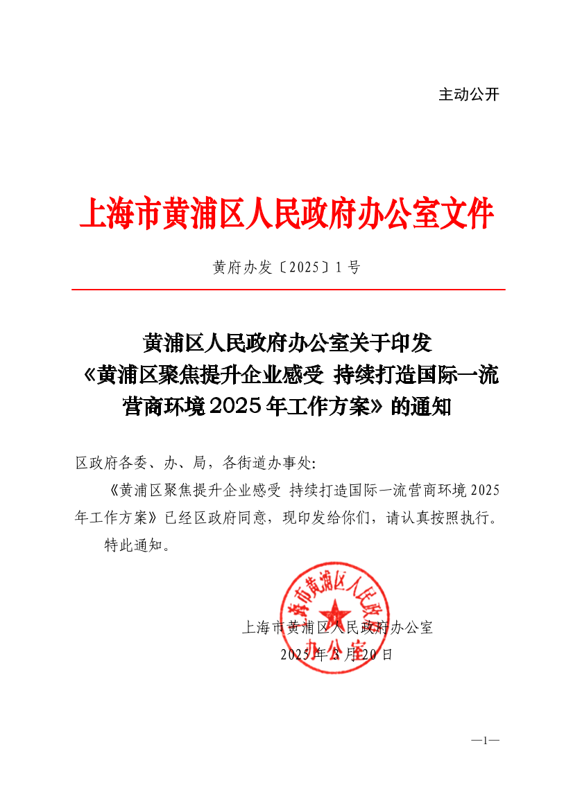 關(guān)于印發(fā)《黃浦區(qū)聚焦提升企業(yè)感受 持續(xù)打造國(guó)際一流營(yíng)商環(huán)境2025年工作方案》的通知