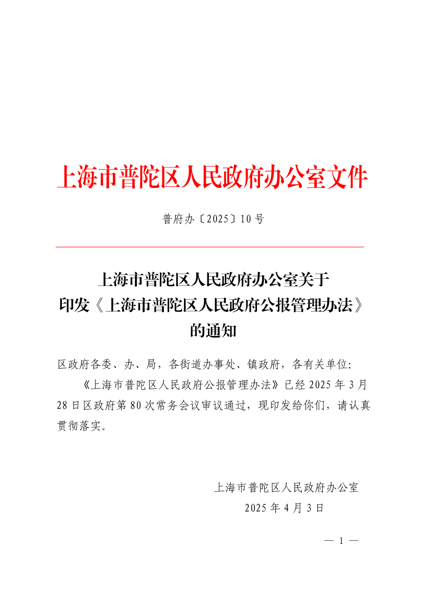 ??《上海市普陀區(qū)人民政府公報(bào)管理辦法》已經(jīng)2025年3月28日區(qū)政府第80次常務(wù)會議審議通過,現(xiàn)印發(fā)給你們,請認(rèn)真貫徹落實(shí)。