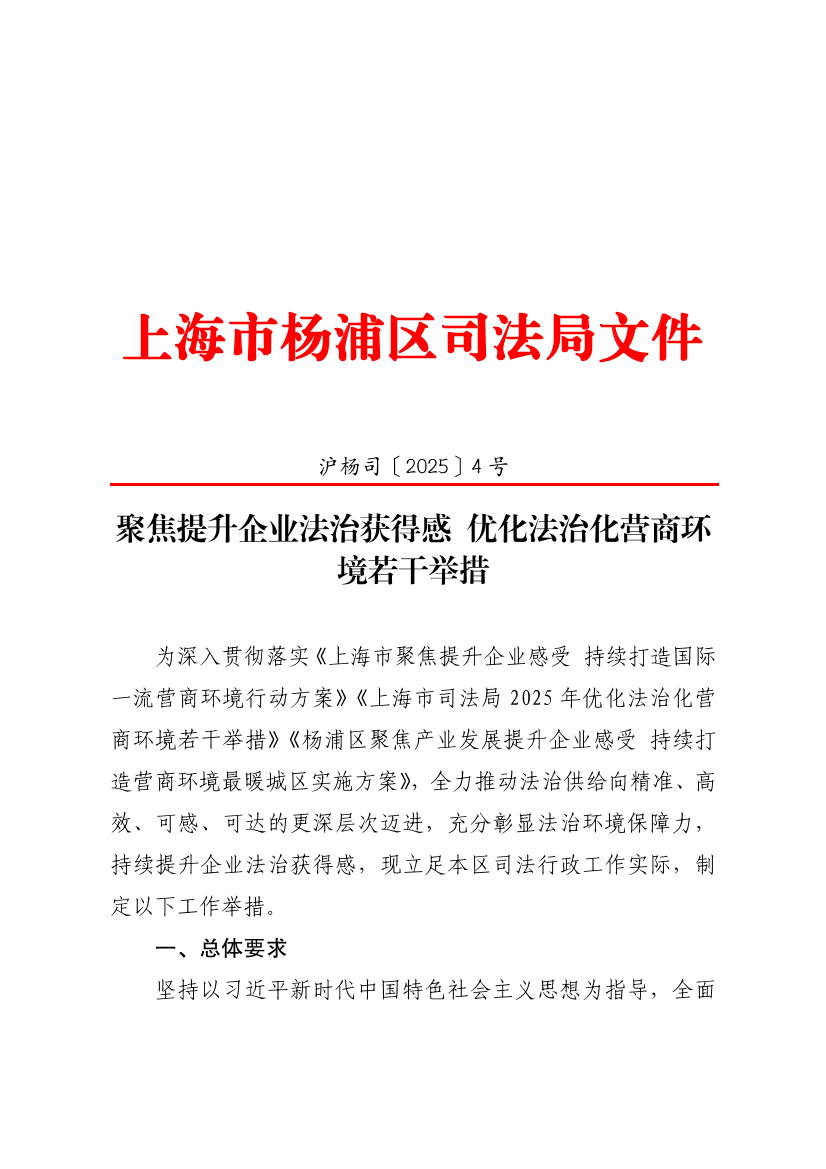 ??為深入貫徹落實《上海市聚焦提升企業(yè)感受 持續(xù)打造國際一流營商環(huán)境行動方案》《上海市司法局2025年優(yōu)化法治化營商環(huán)境若干舉措》《楊浦區(qū)聚焦產業(yè)發(fā)展提升企業(yè)感受 持續(xù)打造營商環(huán)境最暖城區(qū)實施方案》,全力推動法治供給向精準、高效、可感、可達的更深層次邁進,充分彰顯法治環(huán)境保障力,持續(xù)提升企業(yè)法治獲得感,現(xiàn)立足本區(qū)司法行政工作實際,制定以下工作舉措。