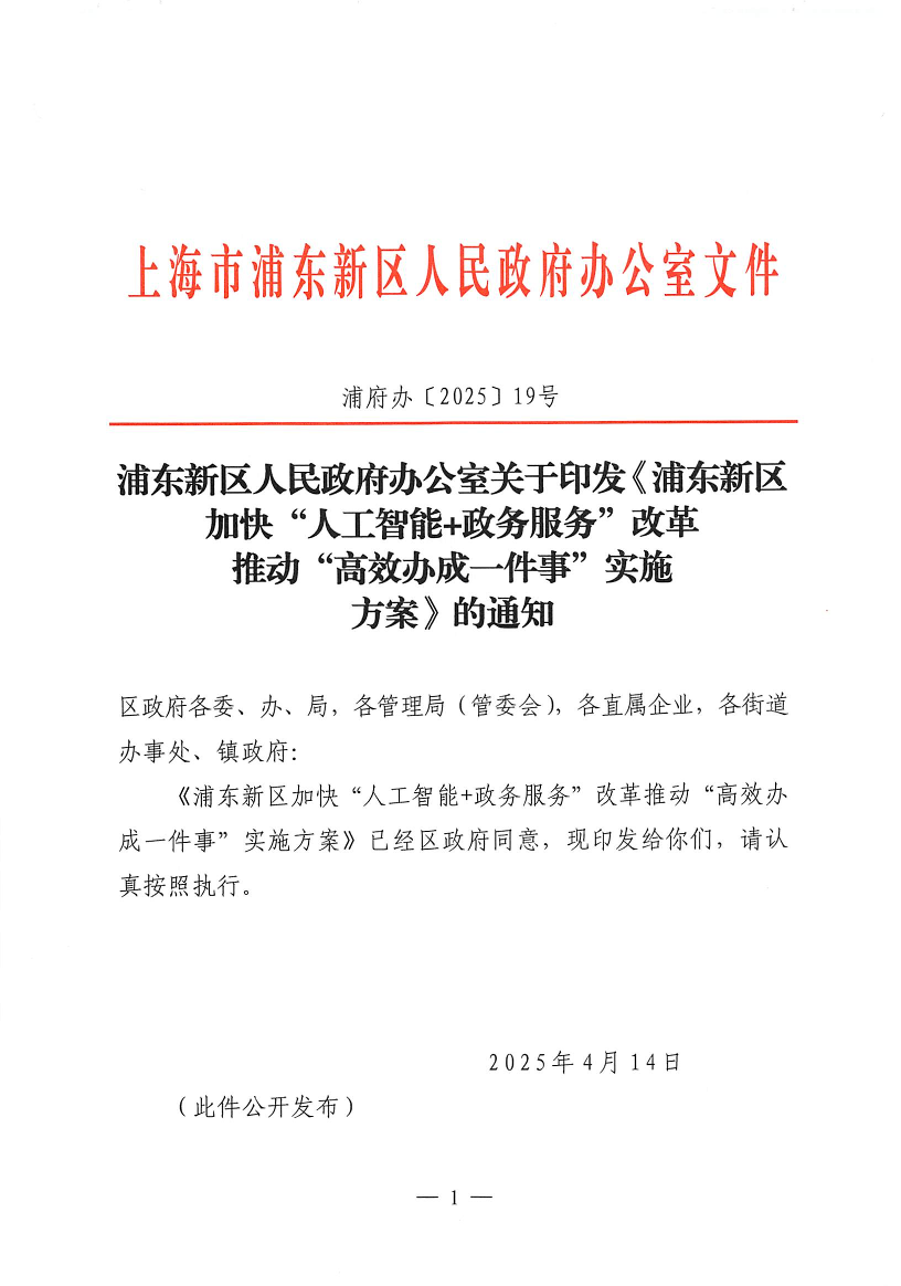 關(guān)于印發(fā)《浦東新區(qū)加快“人工智能+政務(wù)服務(wù)”改革推動(dòng)“高效辦成一件事”實(shí)施方案》的通知