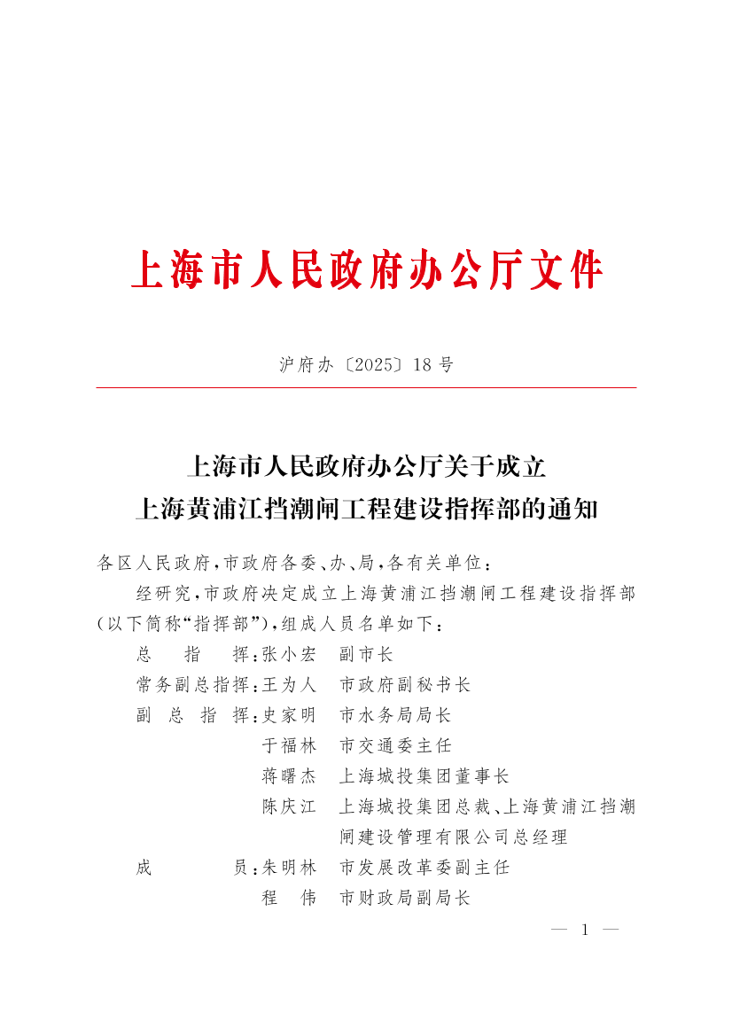 ??經(jīng)研究,市政府決定成立上海黃浦江擋潮閘工程建設(shè)指揮部(以下簡稱“指揮部”),組成人員名單如下: