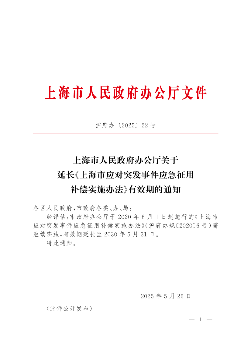 ??經(jīng)評估,市政府辦公廳于2020年6月1日起施行的《上海市應(yīng)對突發(fā)事件應(yīng)急征用補(bǔ)償實(shí)施辦法》(滬府辦規(guī)〔2020〕6號)需繼續(xù)實(shí)施,有效期延長至2030年5月31日。