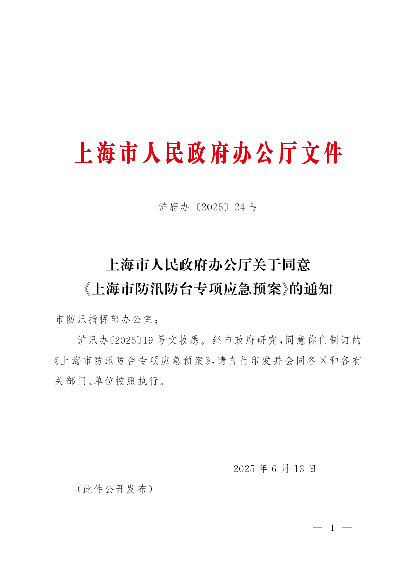 ??滬汛辦〔2025〕19號文收悉。經(jīng)市政府研究,同意你們制訂的《上海市防汛防臺專項應急預案》,請自行印發(fā)并會同各區(qū)和各有關部門、單位按照執(zhí)行。