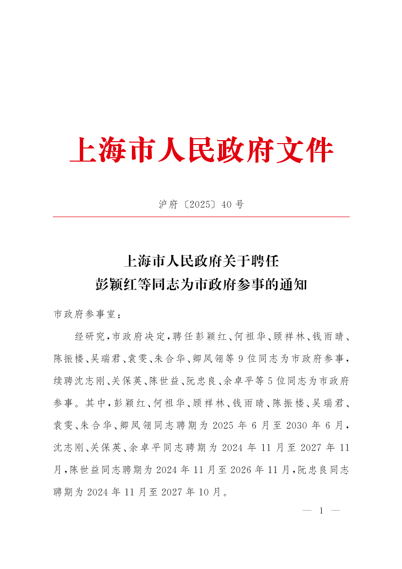 ??經(jīng)研究,市政府決定,聘任彭穎紅、何祖華、顧祥林、錢雨晴、陳振樓、吳瑞君、袁雯、朱合華、卿鳳翎等9位同志為市政府參事,續(xù)聘沈志剛、關(guān)保英、陳世益、阮忠良、余卓平等5位同志為市政府參事。其中,彭穎紅、何祖華、顧祥林、錢雨晴、陳振樓、吳瑞君、袁雯、朱合華、卿鳳翎同志聘期為2025年6月至2030年6月,沈志剛、關(guān)保英、余卓平同志聘期為2024年11月至2027年11月,陳世益同志聘期為2024年11月至2026年11月,阮忠良同志聘期為2024年11月至2027年10月。
