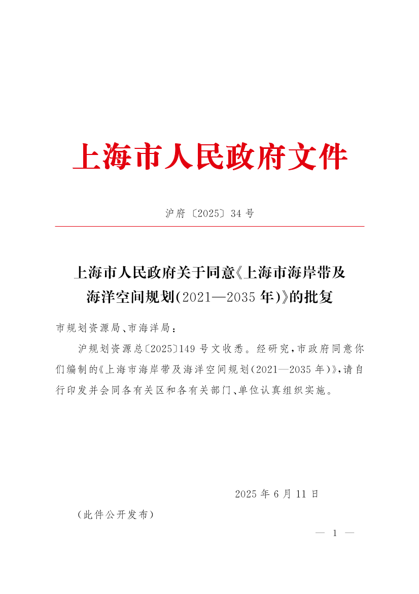 ??滬規(guī)劃資源總〔2025〕149號文收悉。經研究,市政府同意你們編制的《上海市海岸帶及海洋空間規(guī)劃(2021—2035年)》,請自行印發(fā)并會同各有關區(qū)和各有關部門、單位認真組織實施。