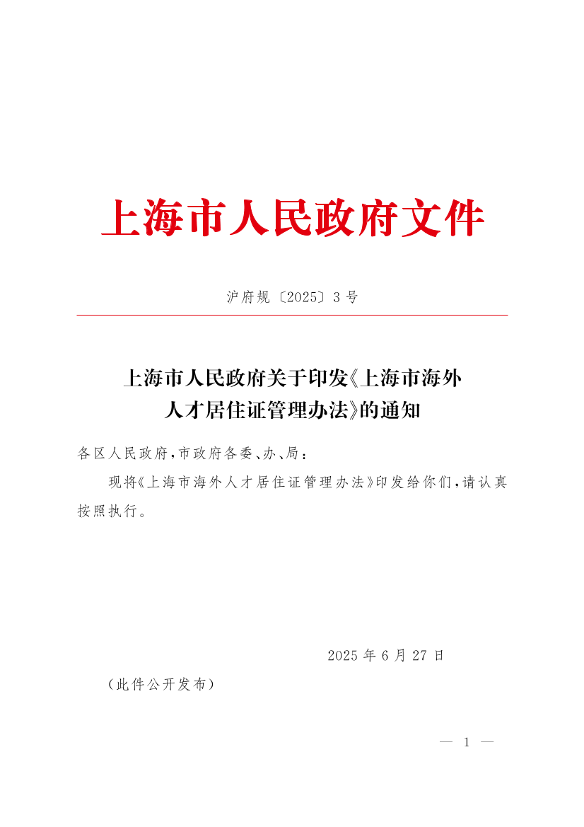 上海市人民政府關(guān)于印發(fā)《上海市海外人才居住證管理辦法》的通知