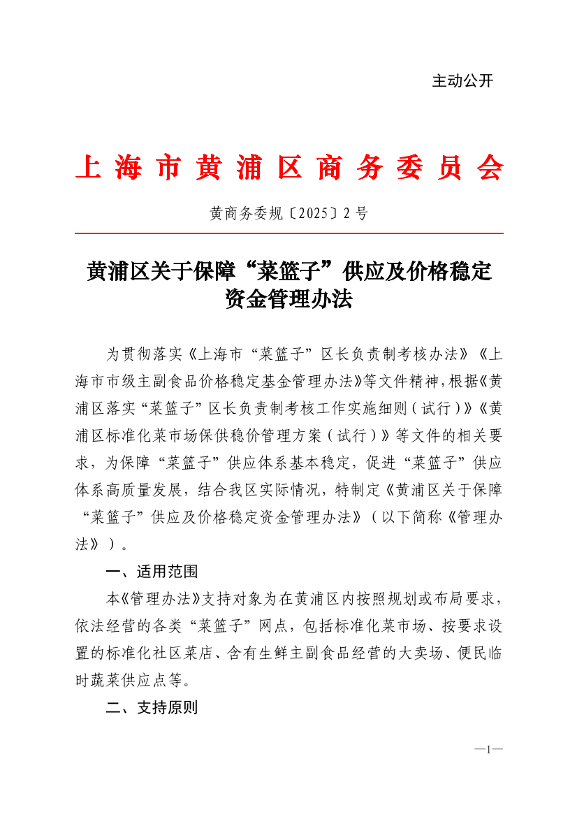 ??本《管理辦法》自2025年7月2日起施行,有效期至2030年7月1日。原《黃浦區(qū)關(guān)于保障主副食品供應(yīng)及價格穩(wěn)定專項資金管理辦法》(黃商務(wù)委〔2019〕43號)同時廢止。