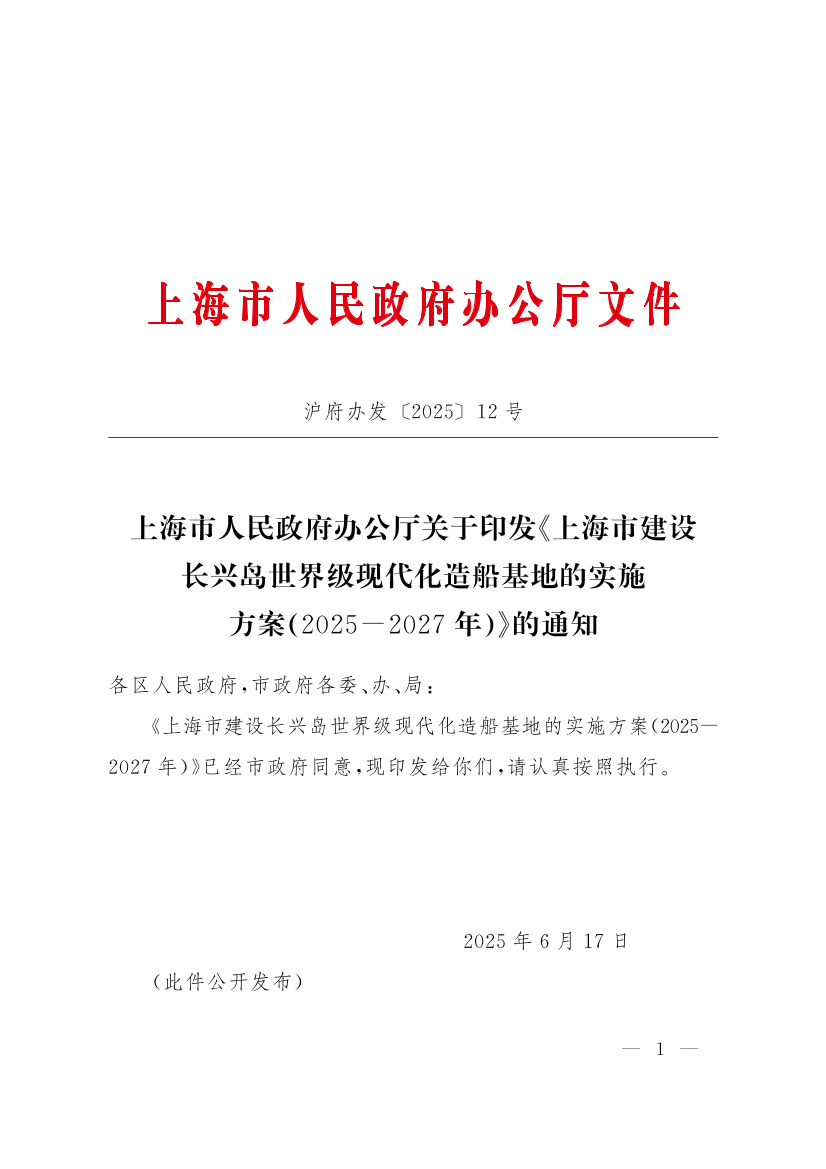 ??《上海市建設(shè)長興島世界級現(xiàn)代化造船基地的實施方案(2025-2027年)》已經(jīng)市政府同意,現(xiàn)印發(fā)給你們,請認(rèn)真按照執(zhí)行。