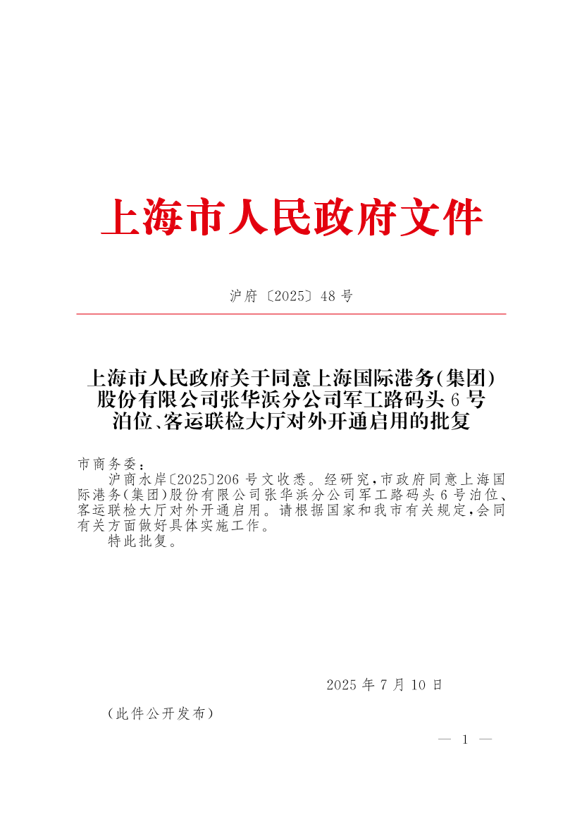??滬商水岸〔2025〕206號(hào)文收悉。經(jīng)研究,市政府同意上海國(guó)際港務(wù)(集團(tuán))股份有限公司張華浜分公司軍工路碼頭6號(hào)泊位、客運(yùn)聯(lián)檢大廳對(duì)外開通啟用。請(qǐng)根據(jù)國(guó)家和我市有關(guān)規(guī)定,會(huì)同有關(guān)方面做好具體實(shí)施工作。