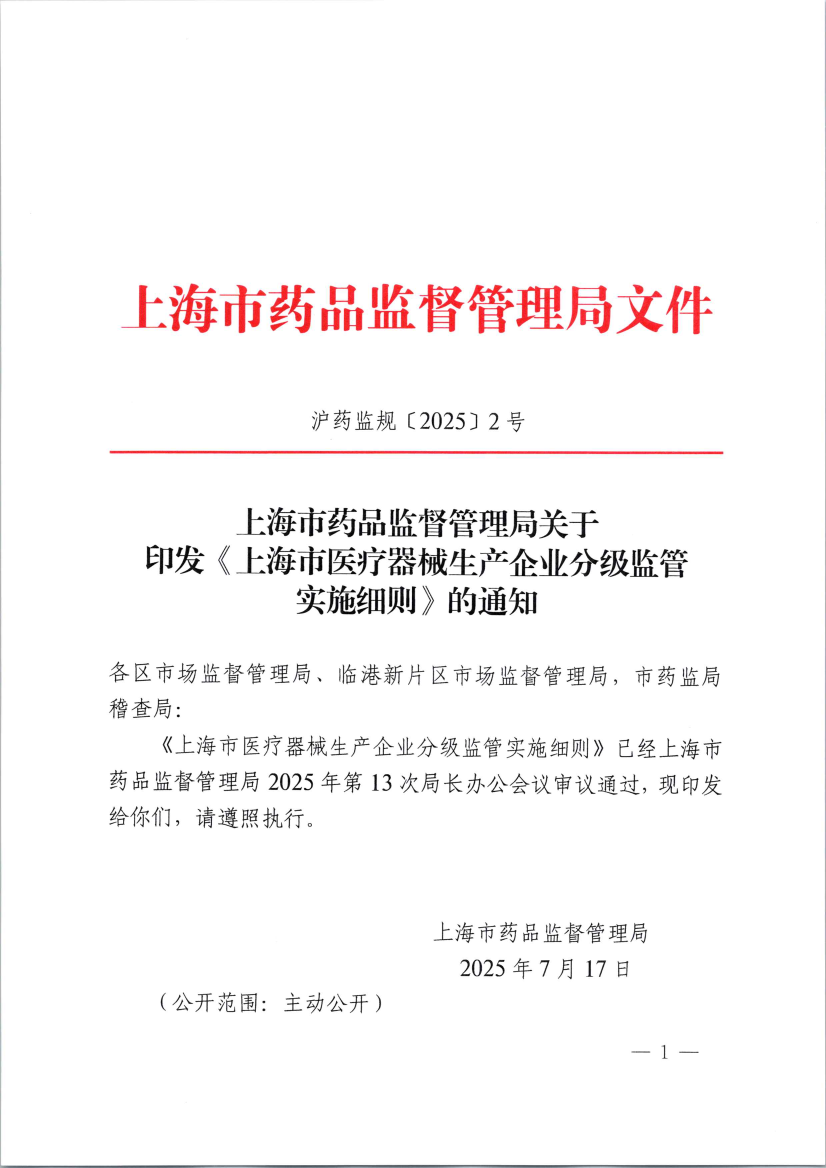 ??《上海市醫(yī)療器械生產企業(yè)分級監(jiān)管實施細則》已經上海市藥品監(jiān)督管理局2025年第13次局長辦公會議審議通過,現印發(fā)給你們,請遵照執(zhí)行。