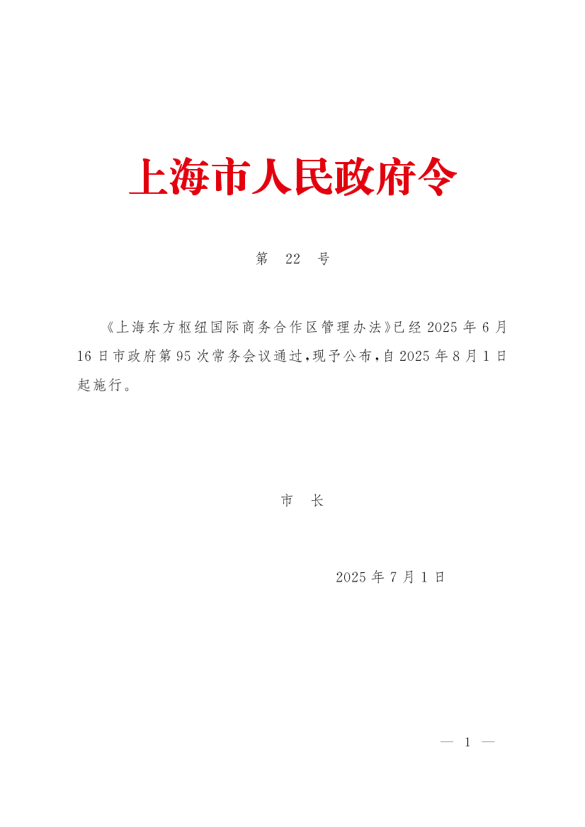 ??《上海東方樞紐國際商務(wù)合作區(qū)管理辦法》已經(jīng)2025年6月16日市政府第95次常務(wù)會議通過,現(xiàn)予公布,自2025年8月1日起施行。