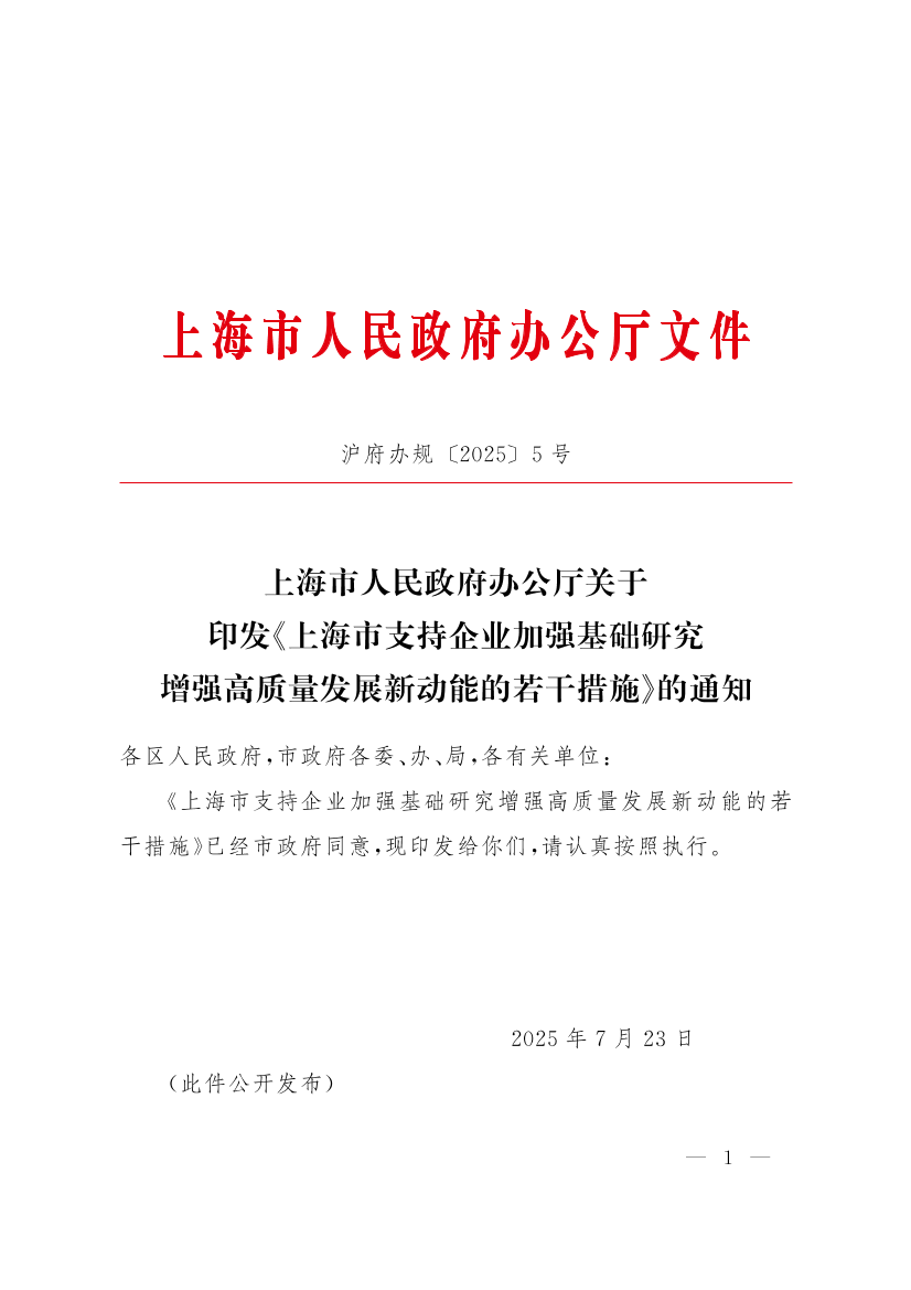 上海市人民政府辦公廳關(guān)于印發(fā)《上海市支持企業(yè)加強基礎(chǔ)研究 增強高質(zhì)量發(fā)展新動能的若干措施》的通知