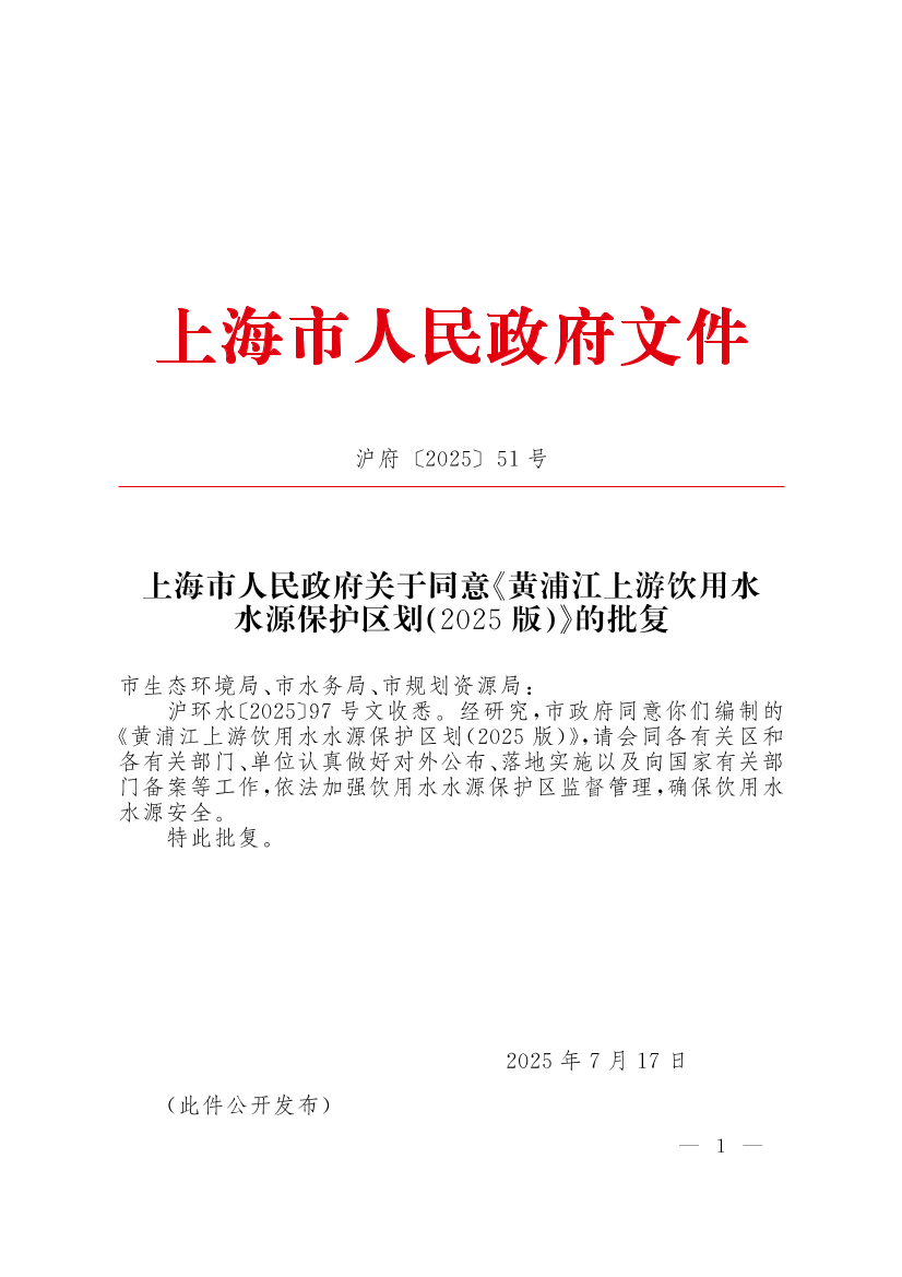 ??滬環(huán)水〔2025〕97號文收悉。經(jīng)研究,市政府同意你們編制的《黃浦江上游飲用水水源保護(hù)區(qū)劃(2025版)》,請會同各有關(guān)區(qū)和各有關(guān)部門、單位認(rèn)真做好對外公布、落地實(shí)施以及向國家有關(guān)部門備案等工作,依法加強(qiáng)飲用水水源保護(hù)區(qū)監(jiān)督管理,確保飲用水水源安全。