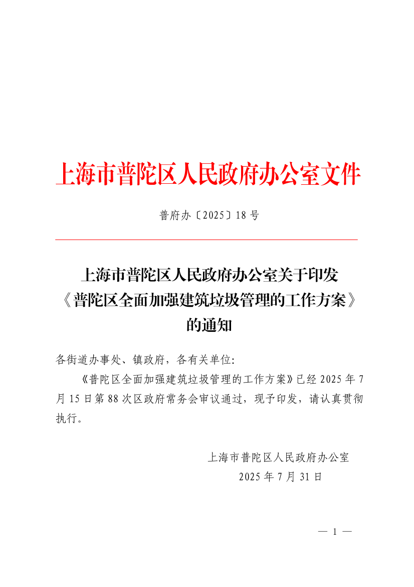 ??《普陀區(qū)全面加強(qiáng)建筑垃圾管理的工作方案》已經(jīng)2025年7月15日第88次區(qū)政府常務(wù)會(huì)審議通過,現(xiàn)予印發(fā),請(qǐng)認(rèn)真貫徹執(zhí)行。