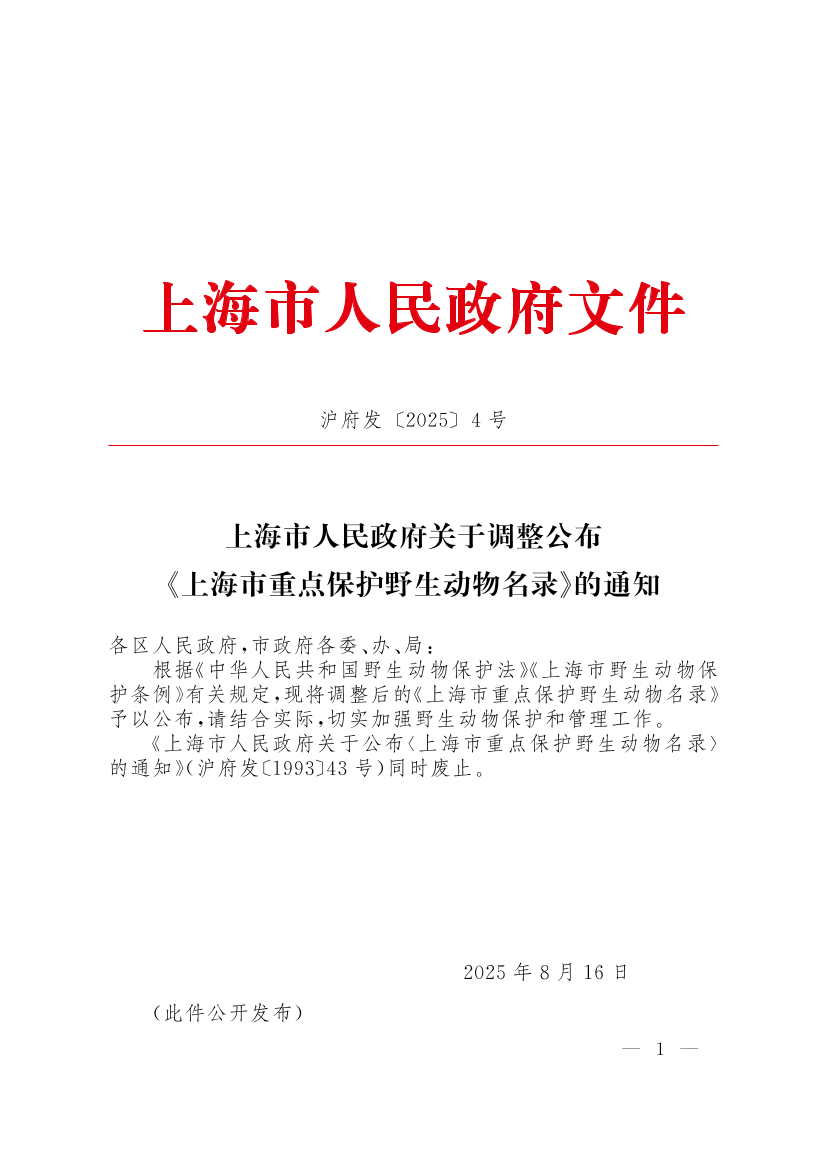 上海市人民政府關于調整公布《上海市重點保護野生動物名錄》的通知