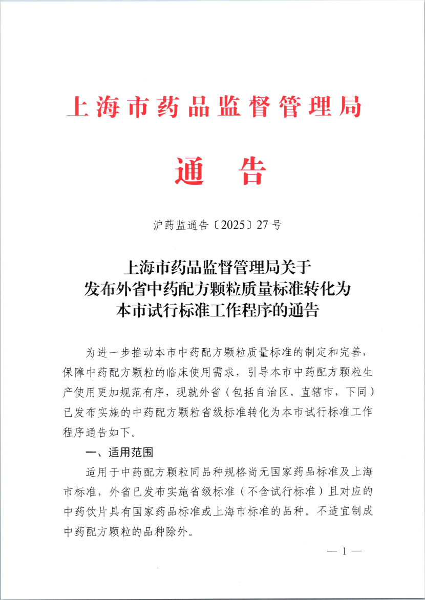??為進一步推動本市中藥配方顆粒質量標準的制定和完善,保障中藥配方顆粒的臨床使用需求,引導本市中藥配方顆粒生產使用更加規(guī)范有序,現(xiàn)就外?。òㄗ灾螀^(qū)、直轄市,下同)已發(fā)布實施的中藥配方顆粒省級標準轉化為本市試行標準工作程序通告如下。