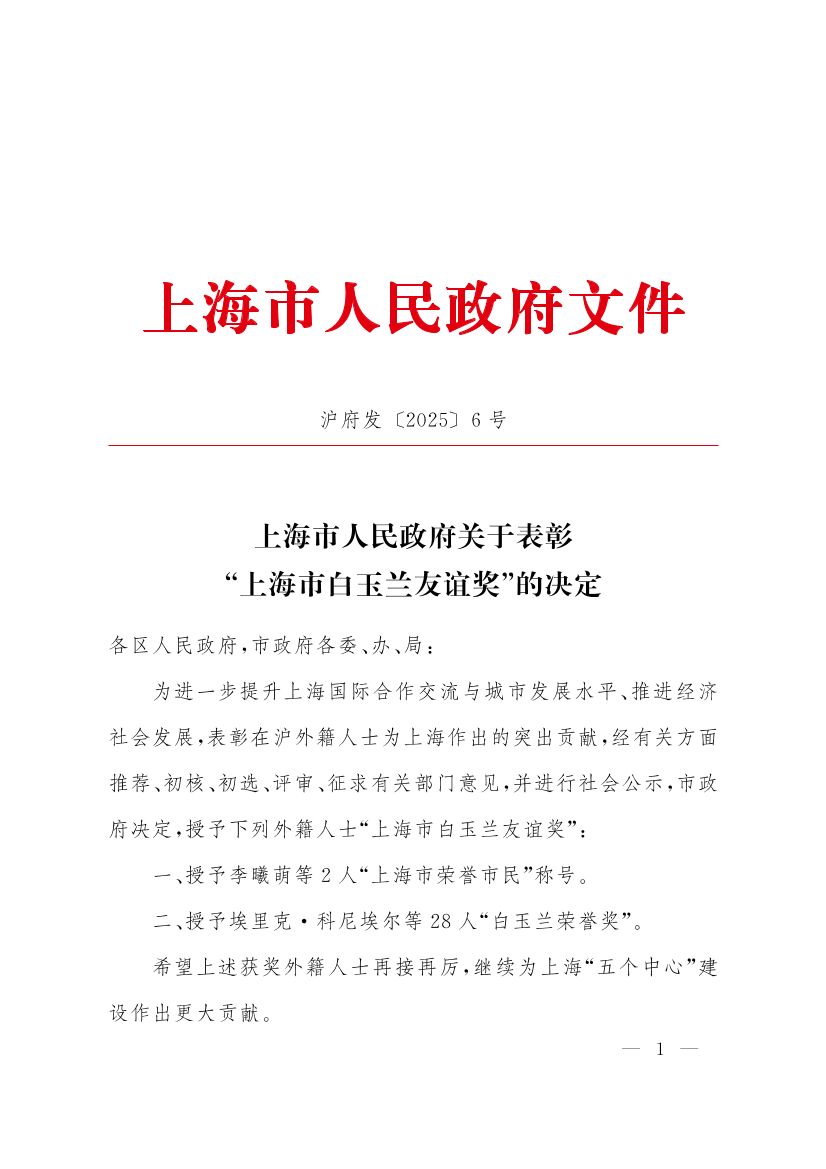 ??為進(jìn)一步提升上海國際合作交流與城市發(fā)展水平、推進(jìn)經(jīng)濟(jì)社會(huì)發(fā)展,表彰在滬外籍人士為上海作出的突出貢獻(xiàn),經(jīng)有關(guān)方面推薦、初核、初選、評(píng)審、征求有關(guān)部門意見,并進(jìn)行社會(huì)公示,市政府決定,授予下列外籍人士“上海市白玉蘭友誼獎(jiǎng)”: