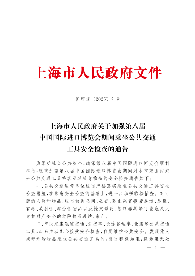 上海市人民政府關(guān)于加強(qiáng)第八屆中國國際進(jìn)口博覽會(huì)期間乘坐公共交通工具安全檢查的通告