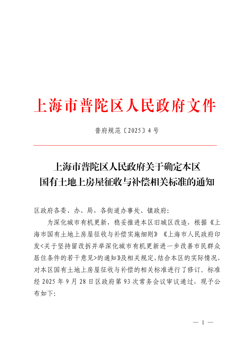 ??本通知自2025年10月10日起施行,有效期至2030年10月10日。2018年10月8日印發(fā)的《上海市普陀區(qū)人民政府關(guān)于確定本區(qū)國有土地上房屋征收與補償相關(guān)標(biāo)準(zhǔn)的通知》(普府規(guī)范〔2018〕3號)、2023年9月28日印發(fā)的《關(guān)于延長<上海市普陀區(qū)人民政府關(guān)于確定本區(qū)國有土地上房屋征收與補償相關(guān)標(biāo)準(zhǔn)的通知>有效期的通知》(普府規(guī)范〔2023〕3號)同時廢止。