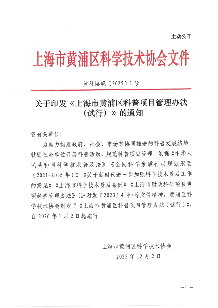 ??為助力構(gòu)建政府、社會(huì)、市場(chǎng)等協(xié)同推進(jìn)的科普發(fā)展格局,鼓勵(lì)社會(huì)單位開展科普活動(dòng),規(guī)范科普項(xiàng)目管理,依據(jù)《中華人民共和國(guó)科學(xué)技術(shù)普及法》《全民科學(xué)素質(zhì)行動(dòng)規(guī)劃綱要(2021-2035年)》《關(guān)于新時(shí)代進(jìn)一步加強(qiáng)科學(xué)技術(shù)普及工作的意見》《上海市科學(xué)技術(shù)普及條例》《上海市財(cái)政科研項(xiàng)目專項(xiàng)經(jīng)費(fèi)管理辦法》(滬財(cái)發(fā)〔2023〕4號(hào))等文件精神,黃浦區(qū)科學(xué)技術(shù)協(xié)會(huì)制定了《上海市黃浦區(qū)科普項(xiàng)目管理辦法(試行)》,自2026年1月2日起施行。