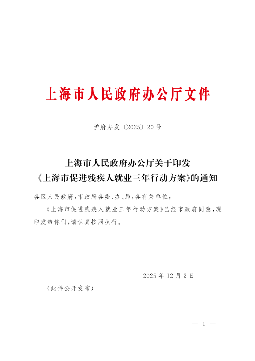 上海市人民政府辦公廳關(guān)于印發(fā)《上海市促進(jìn)殘疾人就業(yè)三年行動方案》的通知