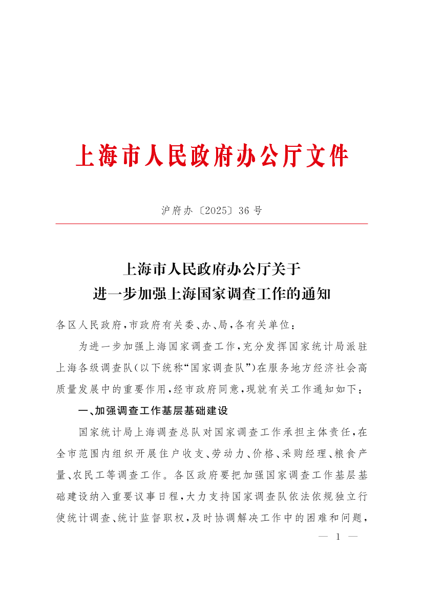 ??為進一步加強上海國家調(diào)查工作,充分發(fā)揮國家統(tǒng)計局派駐上海各級調(diào)查隊(以下統(tǒng)稱“國家調(diào)查隊”)在服務地方經(jīng)濟社會高質(zhì)量發(fā)展中的重要作用,經(jīng)市政府同意,現(xiàn)就有關工作通知如下: