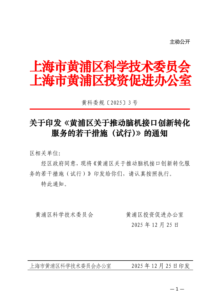 關于印發(fā)《黃浦區(qū)關于推動腦機接口創(chuàng)新轉化服務的若干措施(試行)》的通知