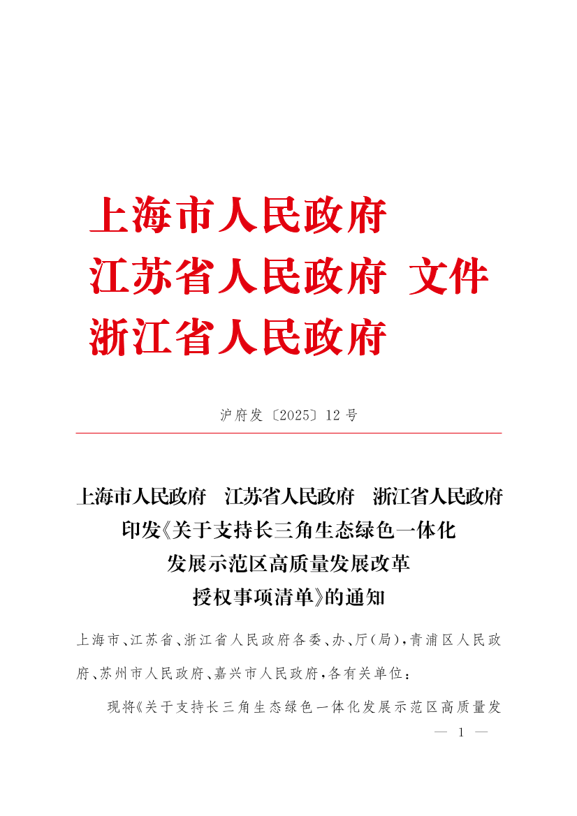 上海市人民政府 江蘇省人民政府 浙江省人民政府印發(fā)《關(guān)于支持長三角生態(tài)綠色一體化發(fā)展示范區(qū)高質(zhì)量發(fā)展改革授權(quán)事項清單》的通知
