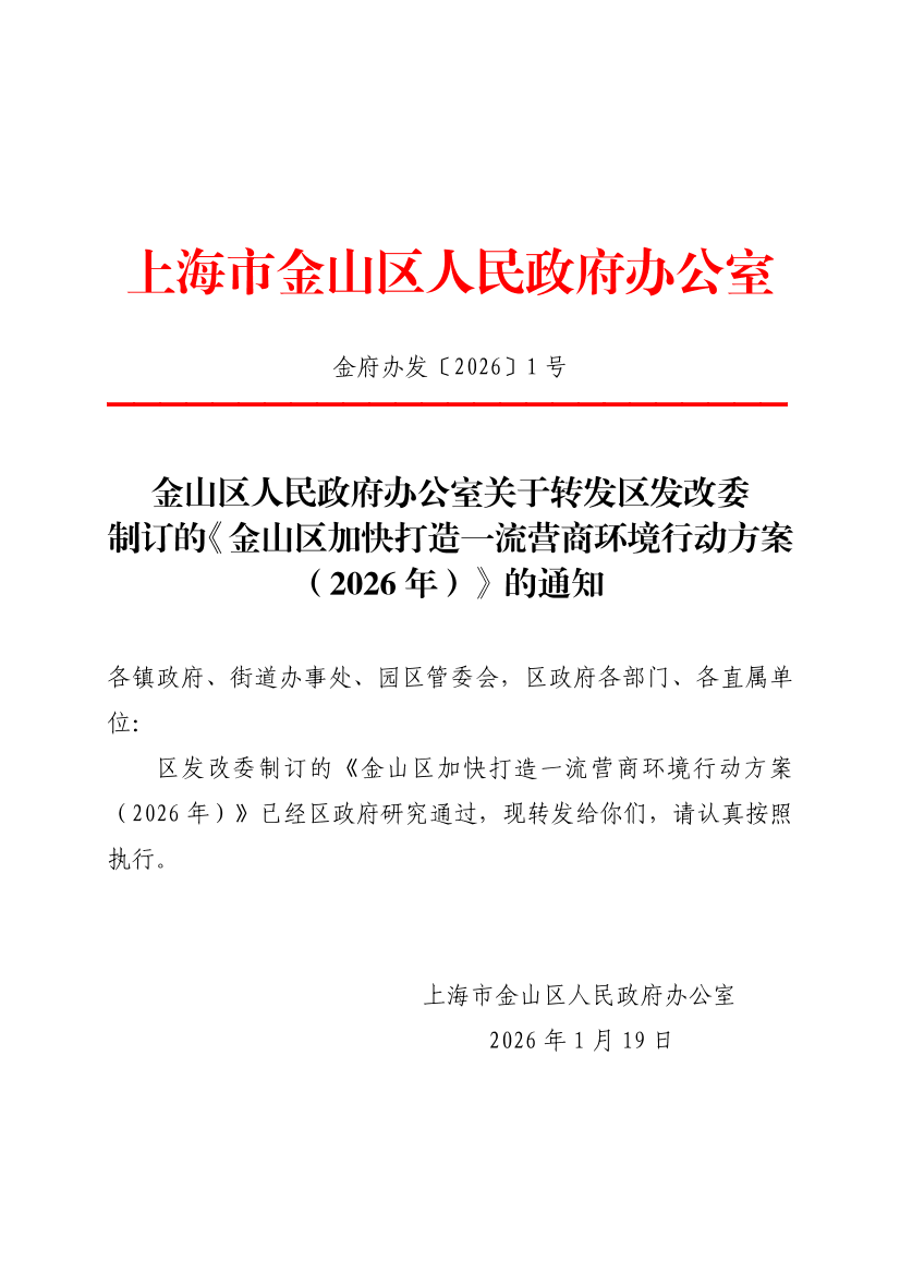 關(guān)于轉(zhuǎn)發(fā)區(qū)發(fā)改委制訂的《金山區(qū)加快打造一流營商環(huán)境行動方案(2026年)》的通知