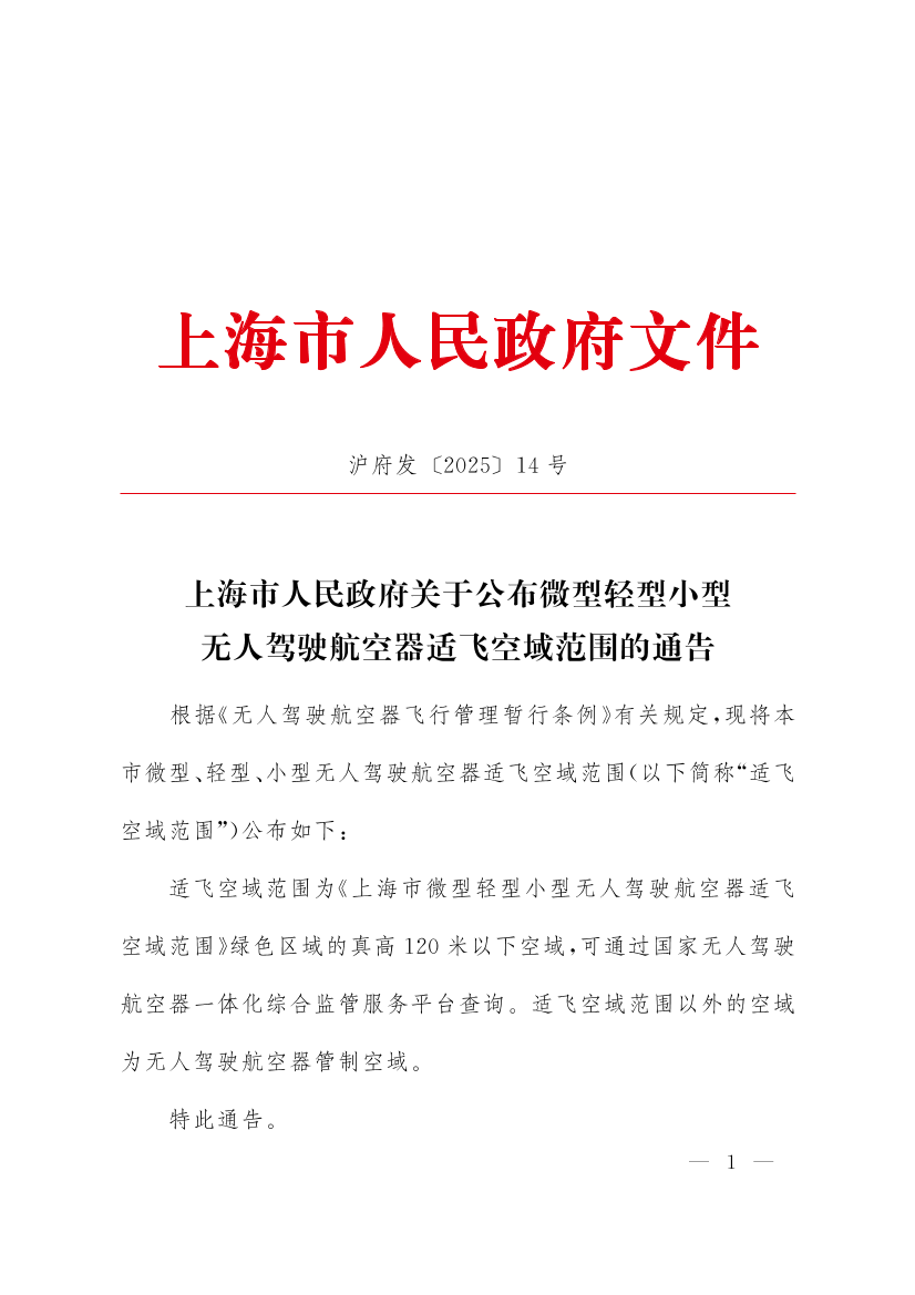 上海市人民政府關(guān)于公布微型輕型小型無(wú)人駕駛航空器適飛空域范圍的通告