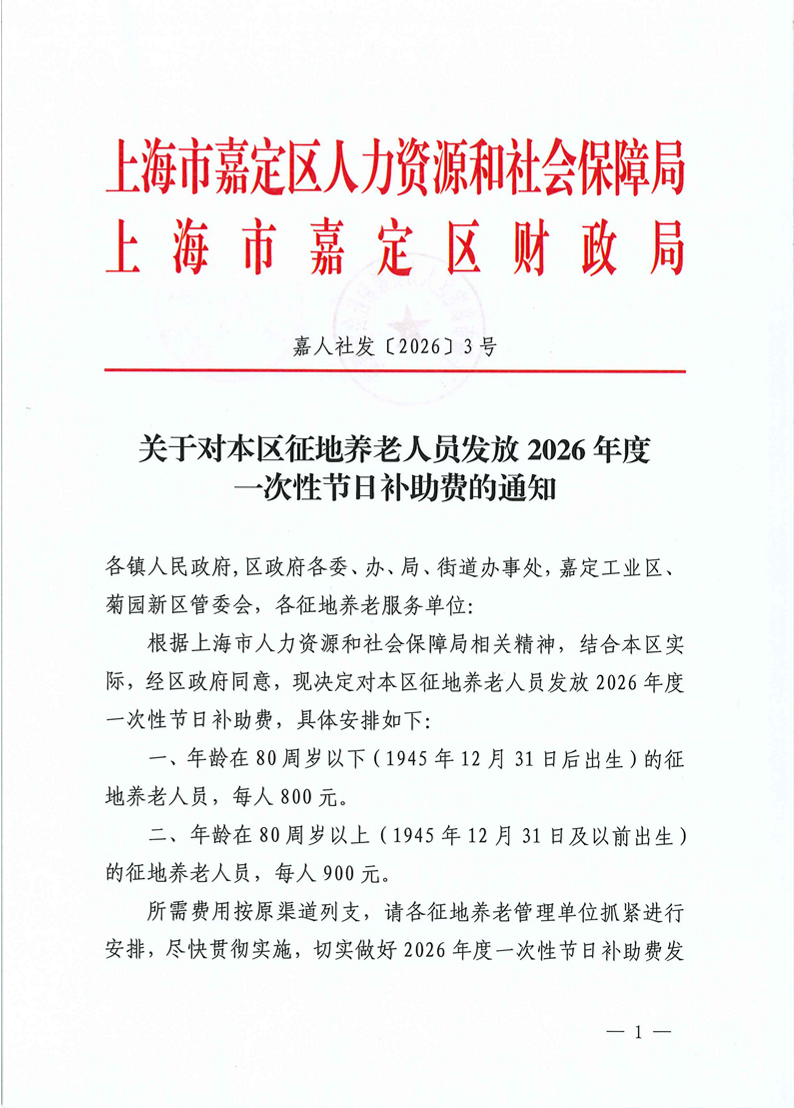 ??根據(jù)上海市人力資源和社會保障局相關精神,結合本區(qū)實際,經(jīng)區(qū)政府同意,現(xiàn)決定對本區(qū)征地養(yǎng)老人員發(fā)放2026年度一次性節(jié)日補助費,具體安排如下: