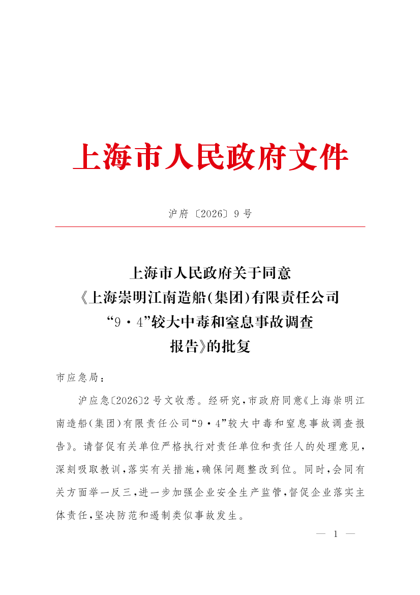 ??滬應(yīng)急〔2026〕2號文收悉。經(jīng)研究,市政府同意《上海崇明江南造船(集團(tuán))有限責(zé)任公司“9·4”較大中毒和窒息事故調(diào)查報告》。請督促有關(guān)單位嚴(yán)格執(zhí)行對責(zé)任單位和責(zé)任人的處理意見,深刻吸取教訓(xùn),落實有關(guān)措施,確保問題整改到位。同時,會同有關(guān)方面舉一反三,進(jìn)一步加強(qiáng)企業(yè)安全生產(chǎn)監(jiān)管,督促企業(yè)落實主體責(zé)任,堅決防范和遏制類似事故發(fā)生。