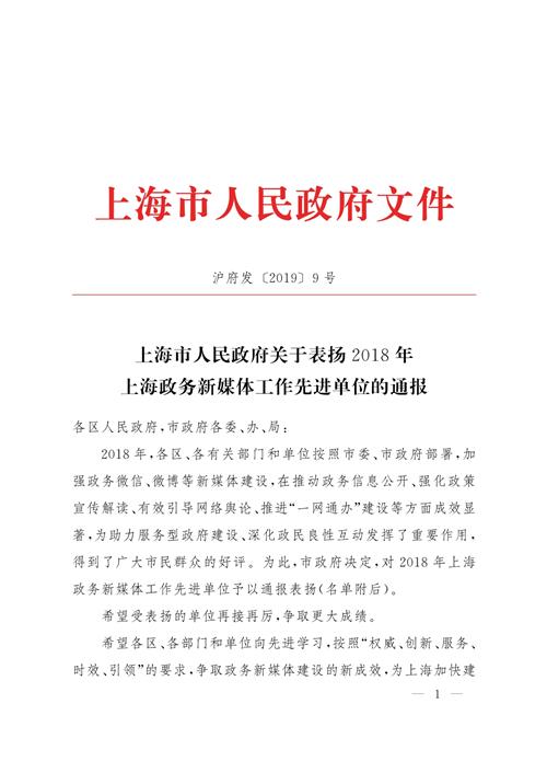 上海市人民政府關(guān)于表?yè)P(yáng)2018年上海政務(wù)新媒體工作先進(jìn)單位的通報(bào)