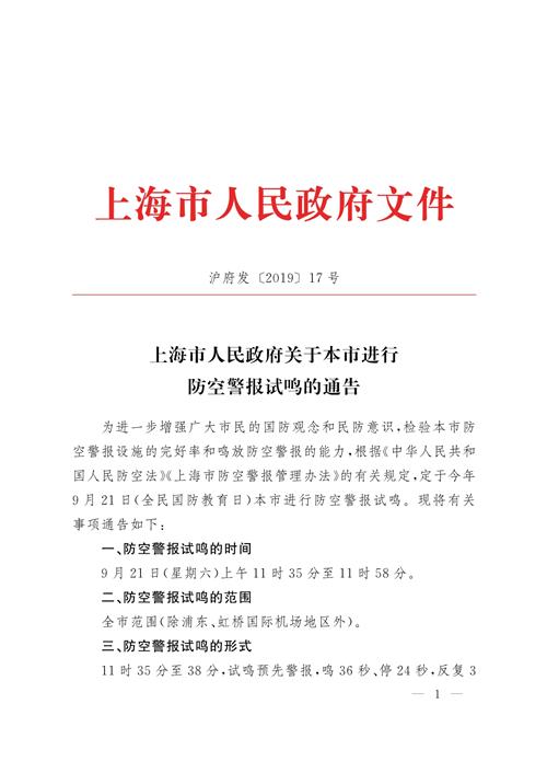 為進(jìn)一步增強(qiáng)廣大市民的國(guó)防觀念和民防意識(shí),檢驗(yàn)本市防空警報(bào)設(shè)施的完好率和鳴放防空警報(bào)的能力,根據(jù)《中華人民共和國(guó)人民防空法》《上海市防空警報(bào)管理辦法》的有關(guān)規(guī)定,定于今年9月21日(全民國(guó)防教育日)本市進(jìn)行防空警報(bào)試?guó)Q?,F(xiàn)將有關(guān)事項(xiàng)通告如下: