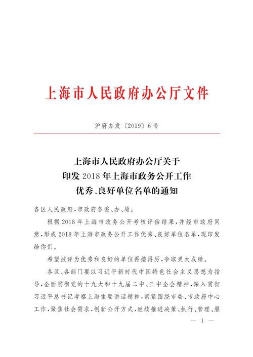 根據(jù)2018年上海市政務(wù)公開考核評估結(jié)果,并經(jīng)市政府同意,形成2018年上海市政務(wù)公開工作優(yōu)秀、良好單位名單,現(xiàn)印發(fā)給你們。
