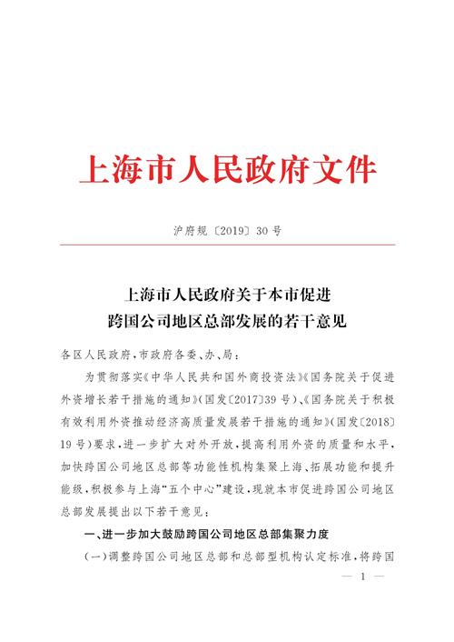 為貫徹落實《中華人民共和國外商投資法》《國務(wù)院關(guān)于促進(jìn)外資增長若干措施的通知》(國發(fā)〔2017〕39號)、《國務(wù)院關(guān)于積極有效利用外資推動經(jīng)濟(jì)高質(zhì)量發(fā)展若干措施的通知》(國發(fā)〔2018〕19號)要求,進(jìn)一步擴(kuò)大對外開放,提高利用外資的質(zhì)量和水平,加快跨國公司地區(qū)總部等功能性機(jī)構(gòu)集聚上海、拓展功能和提升能級,積極參與上海“五個中心”建設(shè),現(xiàn)就本市促進(jìn)跨國公司地區(qū)總部發(fā)展提出以下若干意見: