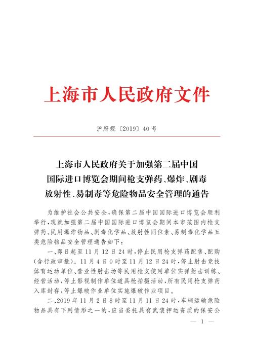 上海市人民政府關(guān)于加強第二屆中國國際進口博覽會期間槍支彈藥、爆炸、劇毒放射性、易制毒等危險物品安全管理的通告
