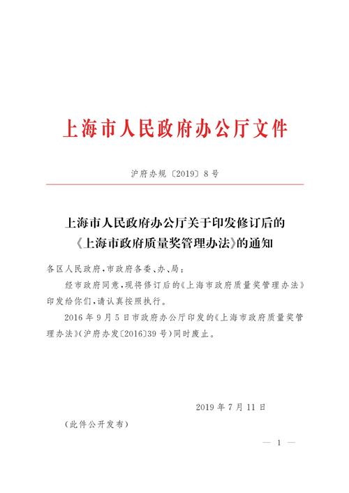 經(jīng)市政府同意,現(xiàn)將修訂后的《上海市政府質(zhì)量獎管理辦法》印發(fā)給你們,請認(rèn)真按照執(zhí)行。