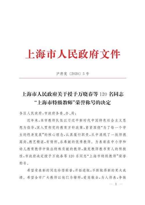 上海市人民政府關(guān)于授予萬曉春等120名同志“上海市特級教師”榮譽(yù)稱號的決定
