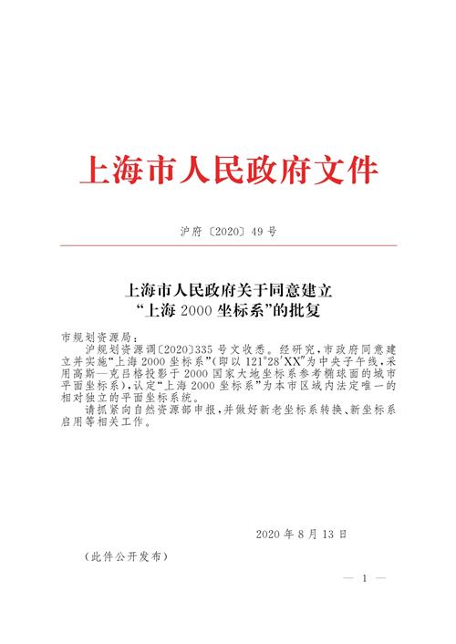滬規(guī)劃資源調(diào)〔2020〕335號(hào)文收悉。經(jīng)研究,市政府同意建立并實(shí)施“上海2000坐標(biāo)系”(即以121°28′XX″為中央子午線,采用高斯—克呂格投影于2000國家大地坐標(biāo)系參考橢球面的城市平面坐標(biāo)系),認(rèn)定“上海2000坐標(biāo)系”為本市區(qū)域內(nèi)法定唯一的相對(duì)獨(dú)立的平面坐標(biāo)系統(tǒng)。