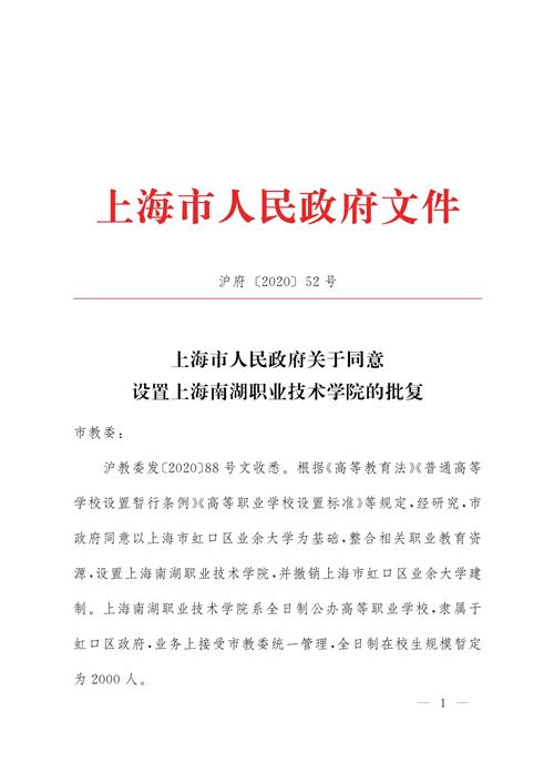 滬教委發(fā)〔2020〕88號(hào)文收悉。根據(jù)《高等教育法》《普通高等學(xué)校設(shè)置暫行條例》《高等職業(yè)學(xué)校設(shè)置標(biāo)準(zhǔn)》等規(guī)定,經(jīng)研究,市政府同意以上海市虹口區(qū)業(yè)余大學(xué)為基礎(chǔ),整合相關(guān)職業(yè)教育資源,設(shè)置上海南湖職業(yè)技術(shù)學(xué)院,并撤銷上海市虹口區(qū)業(yè)余大學(xué)建制。上海南湖職業(yè)技術(shù)學(xué)院系全日制公辦高等職業(yè)學(xué)校,隸屬于虹口區(qū)政府,業(yè)務(wù)上接受市教委統(tǒng)一管理,全日制在校生規(guī)模暫定為2000人。