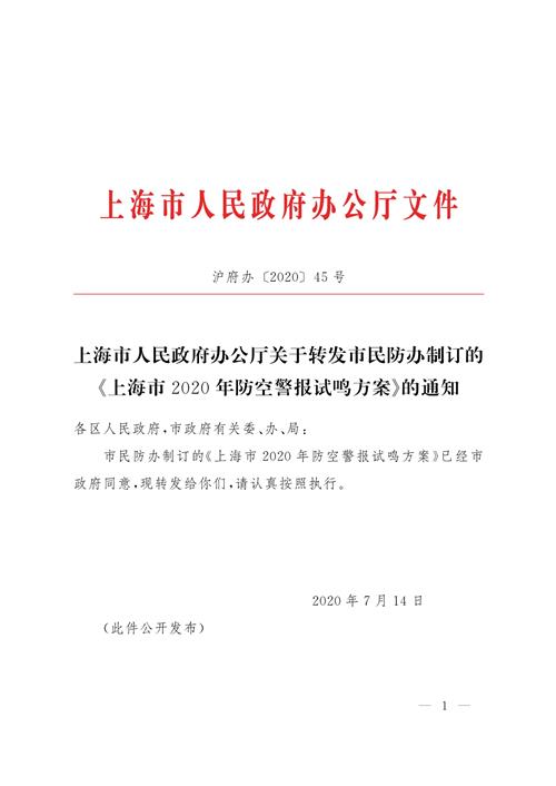 上海市人民政府辦公廳關(guān)于轉(zhuǎn)發(fā)市民防辦制訂的《上海市2020年防空警報(bào)試?guó)Q方案》的通知